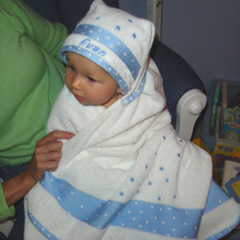 Keep your little one all snuggled and warm in this personalized hooded towel. Its hooded corner keeps baby's wet head warm and dry after bathtime. Choose polka-dot, duck or clothes line designs. Our hooded towel is 100% cotton terry cloth and measures 49"x 28", great size for newborns, toddlers and preschoolers. May be embroidered with name up to 15 characters.