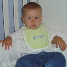 These beautiful luxorious velour bibs are lined with plush terry cloth. Bibs have a tie neck and are ideal for meal time. These machine washable bibs may be embroidered with three initials or a name up to 15 characters.