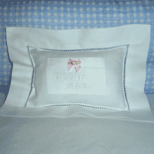 Welcome the tooth fairy with this beautiful embroidered linen pillow bearing the words "Tooth Fairy." Measuring 10.5" x 8.5" this white linen pillow is embellished with either a pink, blue or white bow.