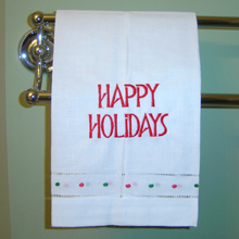 Decorate your home for the holidays with these beautiful holiday linen hand towels. Choose from "Merry Christmas" or "Happy Holidays" designs. Hand towels are white with red writing, %100 linen and machine washable.